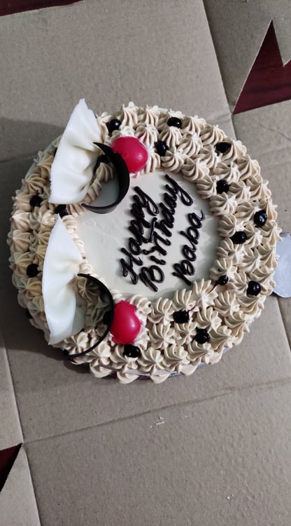 Vanilla Mocha Cake! Brown and delicious cake layers are surrounded by our rich vanilla mousse made with heavy cream. A decorative blend of coffee flavor cream at the top and special design at the base of the cake. It is beautifully topped with cherry and chocolate wafer. This cake can be made both with egg and eggless. Fit for any birthday, anniversary, parties! Special cake in Pokhara.